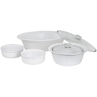 Corningware French White ll 6-piece set. Includes 1-each4-quart oval roaster with glass cover, 1-each2-quart round dish with glass cover, 2-each 24-ounce round dishes. The recipe for a great dish starts, surprisingly, with a great dish!Corningware French White bakeware proves that when it comes to food preparation, few things are more convenient than baking and serving in one dish.With its classic, fluted design, French White oven-to-table bakeware imparts a traditional elegance that is a perfect complement to any décor. Versatile yet stylish, Corningware French White is simple, from start to finish!