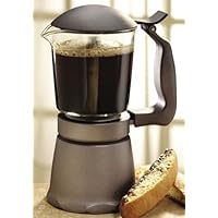 Primula Glass Top Stovetop Espresso Coffee Maker is used for a great tasting espresso. The 6 cup capacity makes 6 demitasse size cups. The glass top allows you to watch the espresso being brewed and you can see when its finished. The exterior is a dark grey. The handle has a soft touch finish.